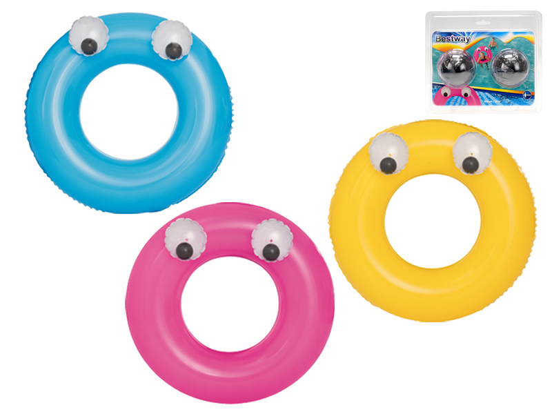 Nafukovací kruh do vody na první pohled zaujme svýma velkýma očima. Rozměr kruhu je 91cm. Ve třech barevných variantách – modrá, žlutá a růžová.