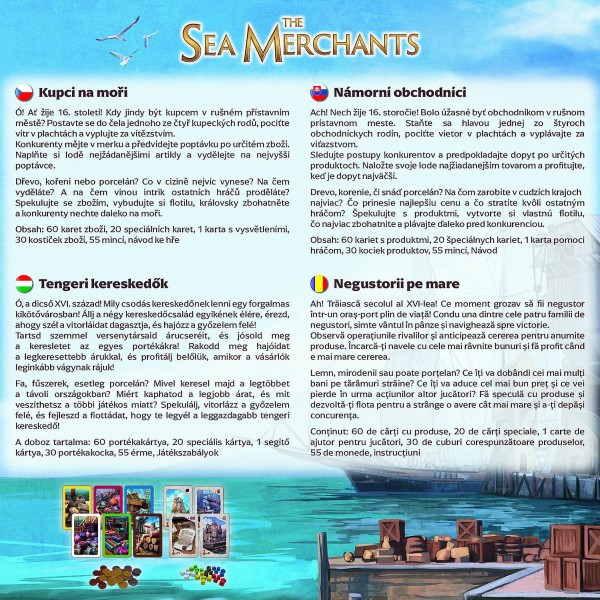 Ó! Ať žije 16. století! Kdy jindy být kupcem v rušném přístavním městě? Postavte se do čela jednoho ze čtyř kupeckých rodů, pociťe vítr v plachtách a vyplujte za vítězstvím. Konkurenty mějte v merku a předvídejte poptávku po určitém zboží. Naplňte si lodě nejžádanějšími artikly a vydělejte na nejvyšší poptávce. Dřevo, koření nebo porcelán? Co v cizině nejvíc vynese? Na čem vyděláte? A na čem vinou intrak ostatních hráčů proděláte? Spekulujte se zbožím, vybudujte si flotilu, královsky zbohatněte a konkurenty nechte daleko na moři. Obsah hry: 60 karet zboží, 20 speciálních karet, 1 karta s vysvětleními, 30 kostiček zboží, 55 mincí a návod ke hře