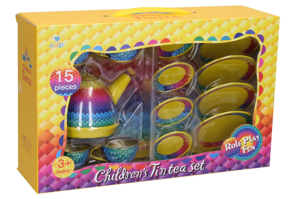 Nádobí plechové sada žlutá 15ks. Obsahuje tác 24cm, konvici 11cm, 2x hrneček 6cm, 4x talířek 5,5cm, 4x talířek 7cm.