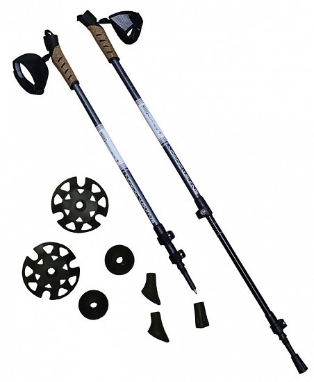 Teleskopické hole 3-dílné – zpevněné ALU tubusy se 40% grafitu, odlehčené , 72 – 145 cm. Korkové rukojeti jsou lehké a příjemné na držení. Upínací pásek na ruce je přizpůsobený tvaru rukou, svou šířkou drží příjemně na rukách a netlačí. Rychloupínací mechanismus umožňuje rychlé nastavení potřebné délky holí. V balení je 1 pár na kartě s příslušenstvím – 2 páry vyměnitelných kroužků, kulaté a oválné gumové koncovky. Hmotnost jedné hole je pouhých 265 gramů. Balení 1 pár na kartě v průhledné folii. HOLE NEMAJÍ ANTISHOCK, RYCHLOUPÍNACÍ SYSTÉM TO NEUMOŽŇUJE. Celkově se jedná o velmi kvalitní hole vhodné i pro náročnější turistiku